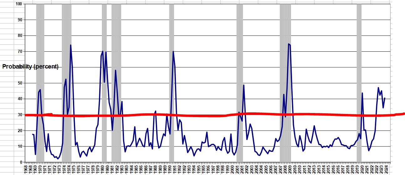Uno degli indicatori di tipo fondamentale e di lungo termine che ci dice le probabilità di entrare in recessione è l'Anxious Index (da non confondere con l' "indice della paura " Vix naturalmente). Elaborato dalla Fed di Philadelphia quattro volte all'anno sulla base di "insider" del mondo economico ed imprenditoriale, in passato tutte le volte che è salito al di sopra del 30% abbiamo avuto una recessione. Attualmente siamo abbondantemente sopra.