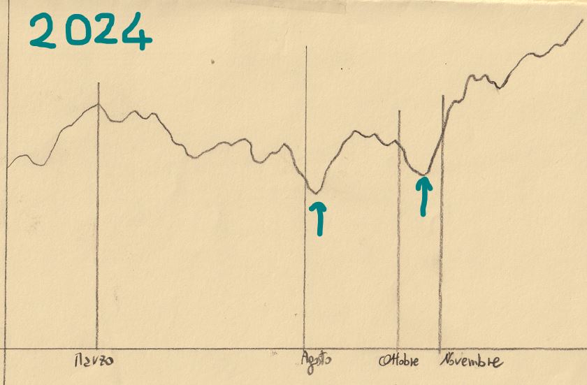 Inizio anno che beneficia ancora dell'inerzia rialzista di fine 2023 e poi un graduale indebolimento da marzo/aprile. I punti più favorevoli per il long sono collocabili a fine luglio/agosto e poi ad ottobre.