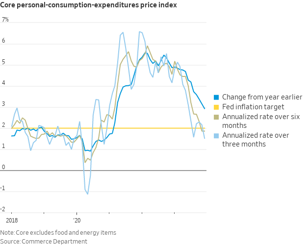 Un ulteriore sorpresa è arrivata dai dati sull’inflazione USA, quelli preferiti dai membri della FED. Il PCE ‘deflator’ è uscito in linea con le attese, mentre il ‘Core’ PCE appena sotto (lo si nota dal "miss" anno su anno). Nel grafico sotto si nota bene il motivo per cui il mercato dei tassi USA continua testardamente a scontare elevata probabilità di un taglio a marzo, nonostante economia robusta e retorica FED più cauta: il PCE ‘core’, a 3 mesi e 6 mesi annualizzato è già sui livelli target, o meglio, sotto (v. grafico):