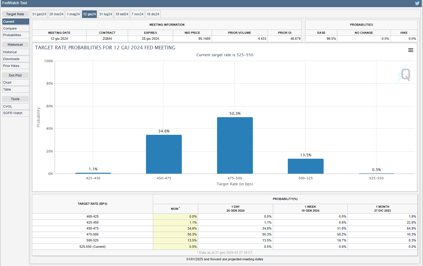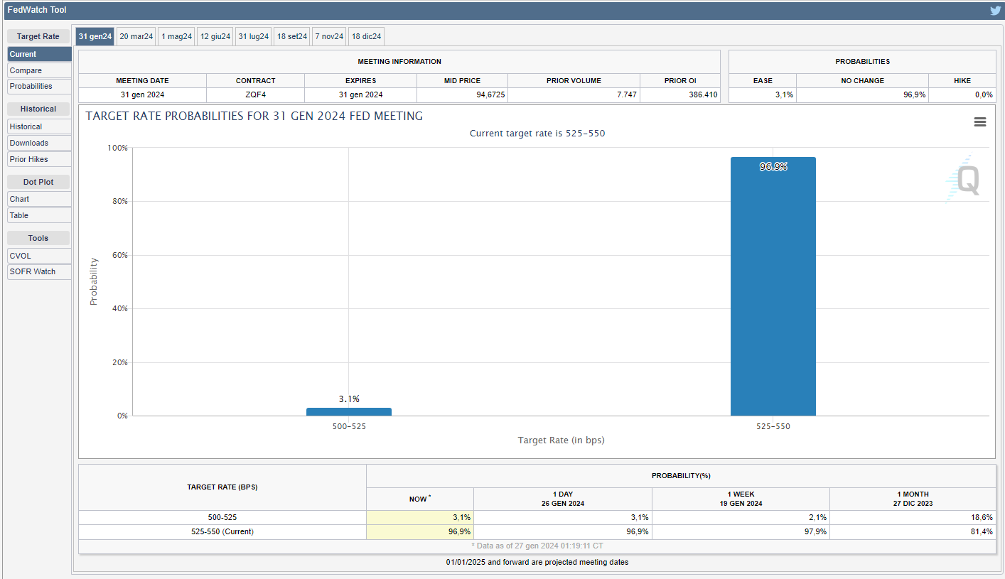 Lo strumento FedWatch del CME Group mostra come i mercati, per la prima riunione del 2024 in programma il 31 gennaio, sono praticamente certi che la FED non taglierà i tassi (v. grafico):