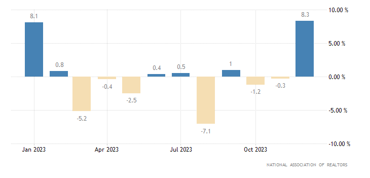 Il dato sulle vendite immobiliari in corso (che misura il cambiamento nel numero di case con contratto di vendita, ma in attesa della transazione di chiusura, escludendo le nuove costruzioni) a livello mensile a dicembre fa un balzo del +8,3%, contro un consensus del +1,5% ed il -0,3% di novembre (rivisto da +0,0%). Il dato è rilasciato dalla National Association of Realtors.