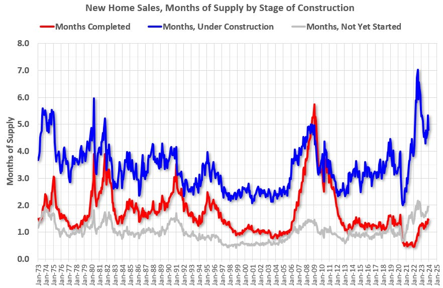 Gli ordini di beni durevoli sono risultati peggio delle attese a dicembre, ma il dato ‘core’ ha invece fatto meglio e le revisioni sono positive. Stessa situazione per la vendita di case nuove di dicembre che hanno sorpreso in positivo recuperando interamente, grazie alle revisioni, il drop di novembre. Detto questo, le scorte di case, tenendo conto di quelle completate, quelle in costruzione e quelle autorizzate, stanno salendo ed è possibile che questo abbia un effetto calmierante su prezzi e attività nei prossimi trimestri (v. grafico):