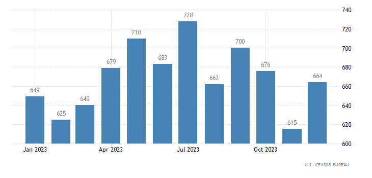 Le vendite di nuove case a livello mensile a dicembre registrano una crescita dell’8,0%, passando dal dato di 615 mila di novembre (rivisto da 590 mila) a quello di dicembre di 664 mila, oltre il consensus di 645 mila. Il dato è rilasciato dall’U.S. Census Bureau.