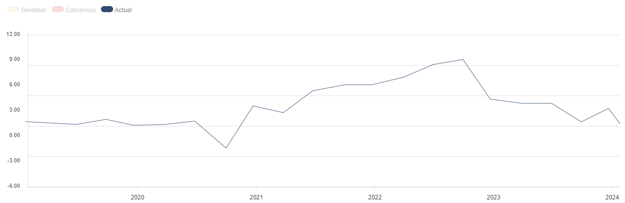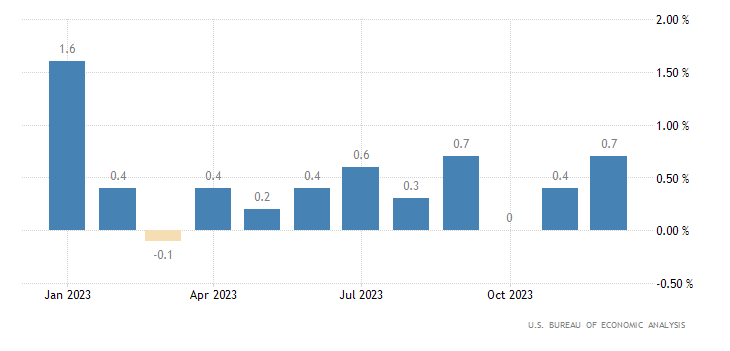 Il dato preliminare del PIL relativo al quarto trimestre 2023 segna un +3,3%, oltre il consensus del +2,0%. Nel terzo trimestre del 2023 era stato registrato un +4,9%. Il dato è rilasciato dall’U.S. Bureau of Economic Analysis.