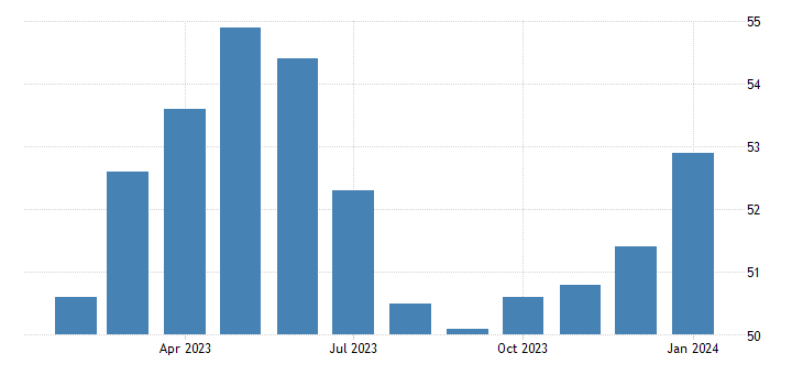 Il dato preliminare di gennaio relativo al settore dei servizi, invece, è a quota 52,9 punti, sopra il consensus di 51,0 punti ed in rialzo rispetto ai 51,4 punti di dicembre.