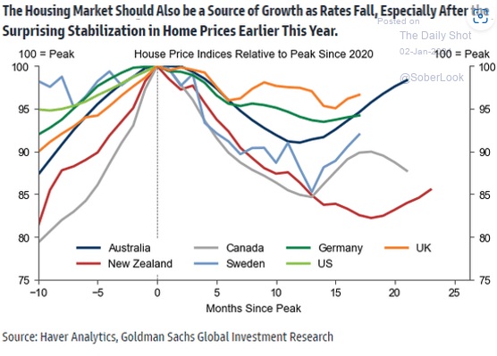 - I bond hanno stornato ieri pesantemente: la festa della maggioranza che sperava nel taglio dei tassi pronti e ripartenza non ha avuto il rally sfrontato. Forse sarà più difficile di quello che si pensava. L’economica mondiale ha assorbito shock e controschock e lo possiamo vedere dalla ripresa del mercato immobiliare in giro per il mondo come dimostra il grafico che segue (numero di mesi dal picco ciclico del mercato immobiliare, notate come le curve hanno segnato un minimo o hanno congestionato e ora stanno recuperando).