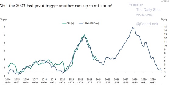 E c’è chi fa a gara per tirare dei paragoni tra l’attuale situazione del mercato monetario e quella degli anni 70: se guardate la linea verde del grafico qui sotto è il CPI (inflazione) degli ultimi 10 anni e quello blu invece è l’inflazione degli anni ’70. Sostanzialmente a livello di stagionalità sono uguali e quello che ci aspetta dal 2024 in poi è un ritorno dell’inflazione. Questo per una ragione semplice: come una malattia l’inflazione non va mai via dopo il primo attacco ma si stabilizza e poi torna alla carica. Quindi teoricamente a partire dalla fine del 2024 dovremo ancora avere un periodo molto duro di iperinflazoine. Io credo il giusto alla stagionalità e per questo non ho annoiato i lettori mostrando i grafici di come sono gli anni di borsa pre-elezioni USA o la media degli ultimi 30 anni degli anni che finiscono con 4 o altre simili giochi di fantasia. La stagionalità ha la sua onorabilità in campo accademico ma da qui a dire che possiamo uscire dal pericolo dell’incertezza futura semplicemente facendo la media dell’andamento dei mesi borsistici ce ne passa.