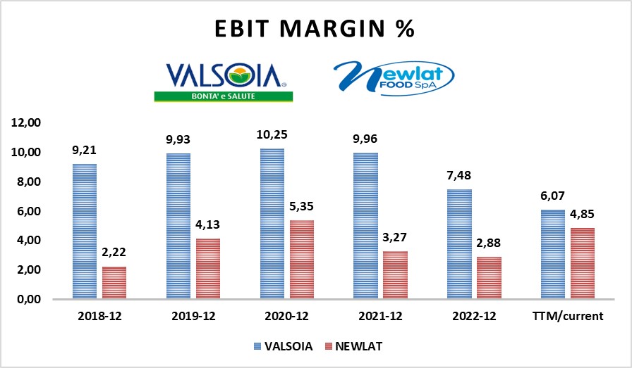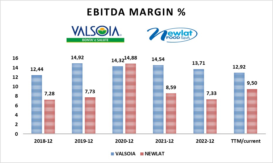 Nell'ultimo anno, NEWLAT, differentemente da VALSOIA ha migliorato il proprio profilo di marginalità portandolo al livello più elevato dal 2018.