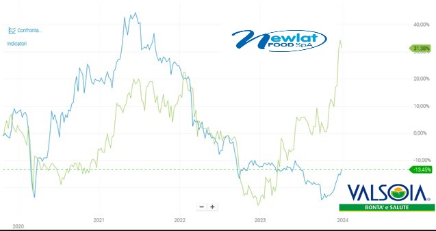 Entrando nel merito, prendiamo come riferimento un titolo selezionato dalla rubrica, VALSOIA, e lo paragoniamo con un'altra realtà impegnata nel mondo del food, NEWLAT. Negli scaffali della GDO troviamo molte delle loro referenze: è evidente che non siano diretti competitor, ma giocano nel medesimo settore.