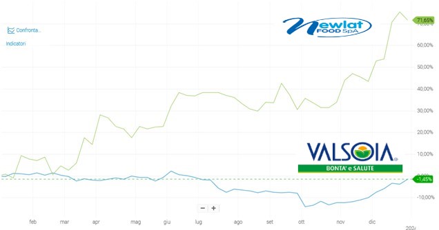 Nell'ultimo anno, NEWLAT è decollata (+71,65%), mentre VALSOIA è stata pressochè stazionaria (+1,45%)