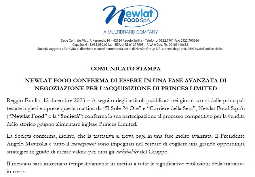 NEWLAT è un player italiano (quotato dal 2019) guidato brillantemente dalla famiglia Mastrolia originariamente impegnata nel mondo della pasta. Grazie a numerose acquisizioni, NEWLAT ha esteso il proprio perimetro anche ad altri settori come latte ed altro (vedi sotto). L'attuale capitalizzazione ammonta a € 337,86 mln.