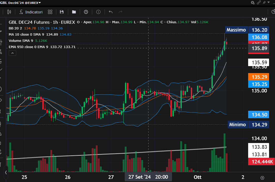 Nella dinamica oraria, evidente l'impulso rialzista che lo fa uscire forte dalle acque, superando anche il precedente massimo di periodo ai 135.6 punti.