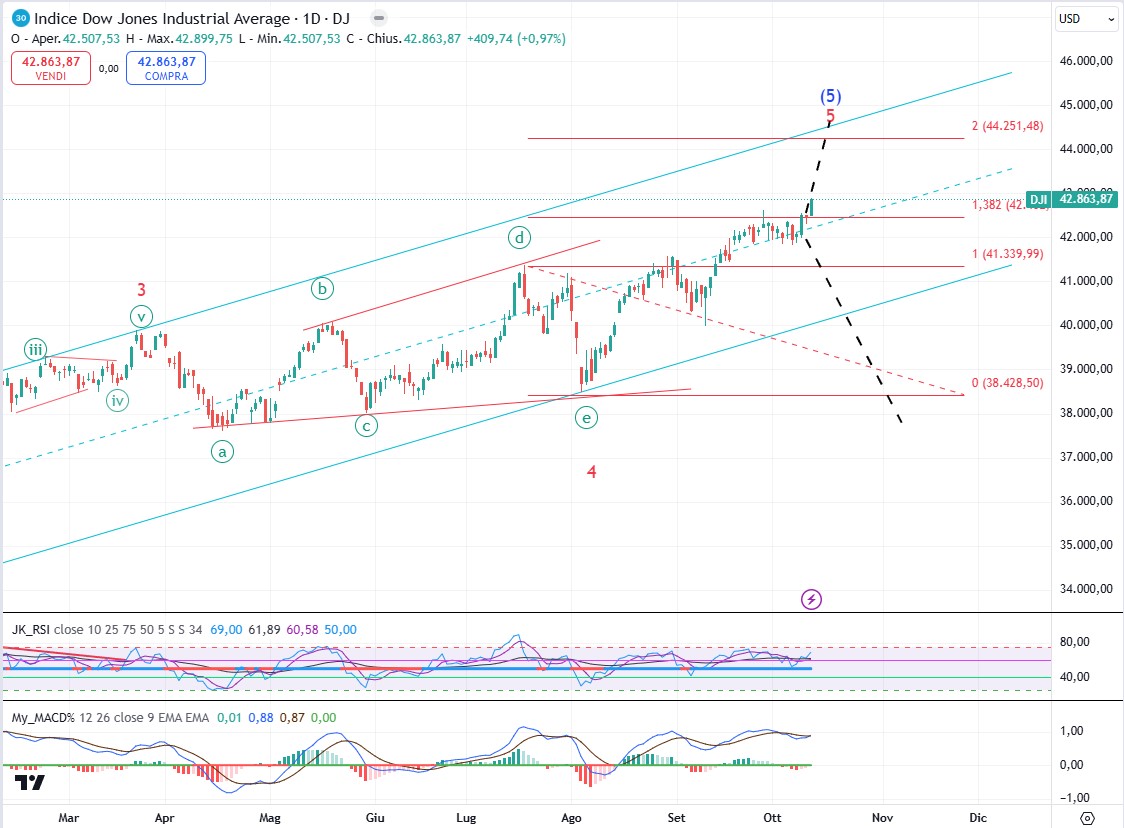 L’indice è ormai vicino alla trendline superiore del canale di trend. Se la salita termina lì, il rientro nel canale di trend e il superamento al ribasso della mediana del canale sarebbe un forte segnale ribassista. Se riesce ad andare oltre la resistenza del canale, allora il target successivo naturale diventa 6227 punti che rappresenta il 200% di onda 4.