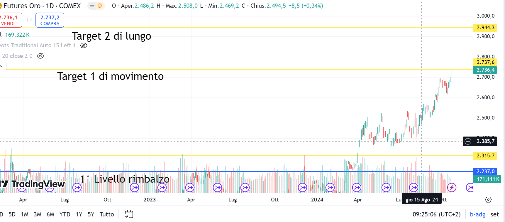 L'oro ha raggiunto esattamente il primo Target che avevamo assegnato in una precedente analisi ai 2737$.