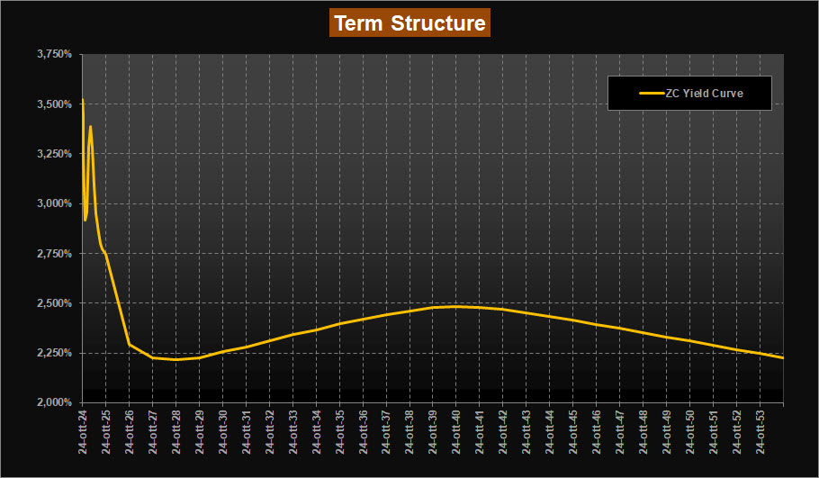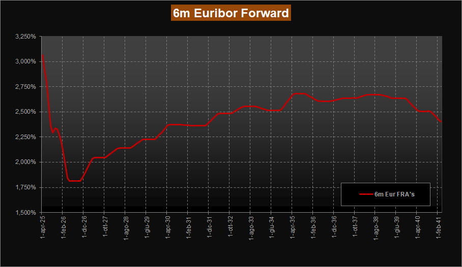 In via di definizione e ancora mutevoli le previsioni fornite dai tassi forward su Euribor 6 mesi sulle scadenze a breve, con tassi attesi ora in area 3,00% per inizio 2025, con la discesa verticale sulla parte a breve che rimane corta in termini di escursione. Sotto questo profilo, sono confermate le aspettative sui tagli dei tassi che portano però la curva dei forward ben sotto area 2,00% e precisamente verso area 1,80%-1,75% per i primi mesi del 2026. Ancora in lieve diminuzione le previsioni di risalita dei tassi, visti ora verso area 2,70%, a partire dal 2035.