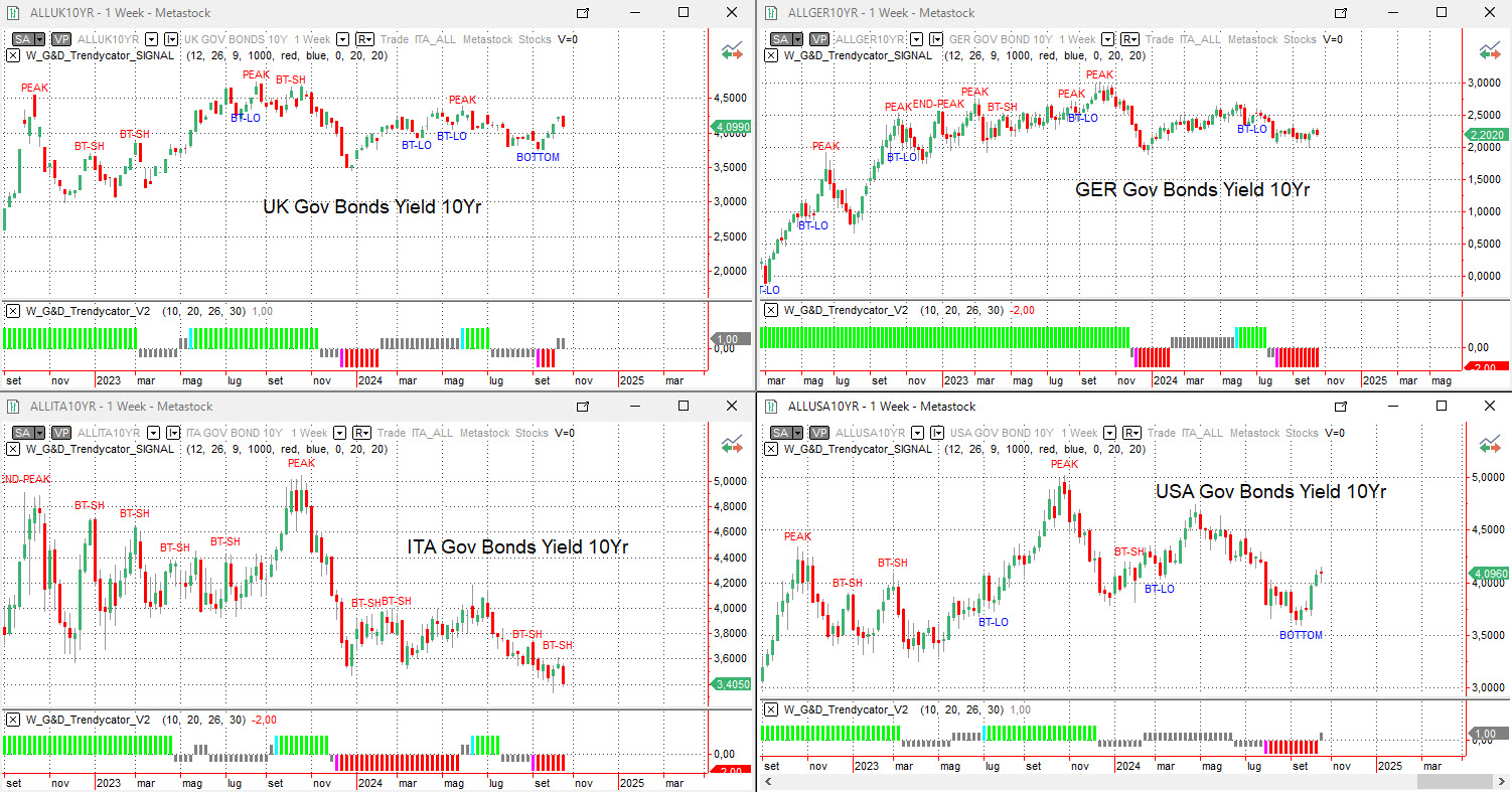 Analizzando con il Trendycator le curve dei rendimenti su scala settimanale dei principali benchmark decennali si nota il proseguimento della fase di incertezza e dei potenziali cambi dell’impostazione generale.