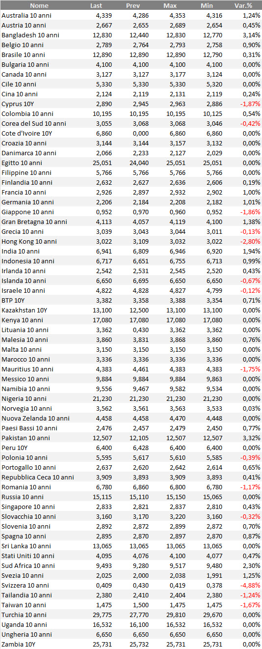 Tabella dei rendimenti, su base settimanale, delle obbligazioni governative mondiali con qualunque rating. Il ranking considera i bond benchmark decennali in tutte le valute di emissione. In alcuni casi, per alcuni emittenti o per alcune valute, il rapporto rischio/rendimento di questi bond può essere anche piuttosto speculativo.