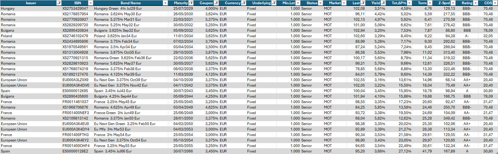 Ancora molto volubile l’evoluzione della conformazione della curva, che mantiene sempre l’inclinazione positiva per un buon tratto, dalle scadenze 2028 sino a quelle del 2040 e con il differenziale 10Y-2Y che torna ad allargarsi portandosi ora a 7 bps. Ancora invariata la pronunciatissima e nervosa inclinazione negativa nel tratto a brevissimo, con la curva che esprime sempre un massimo di rendimento sulle scadenze corte ad inizio 2025 nei pressi di area 3,50%.