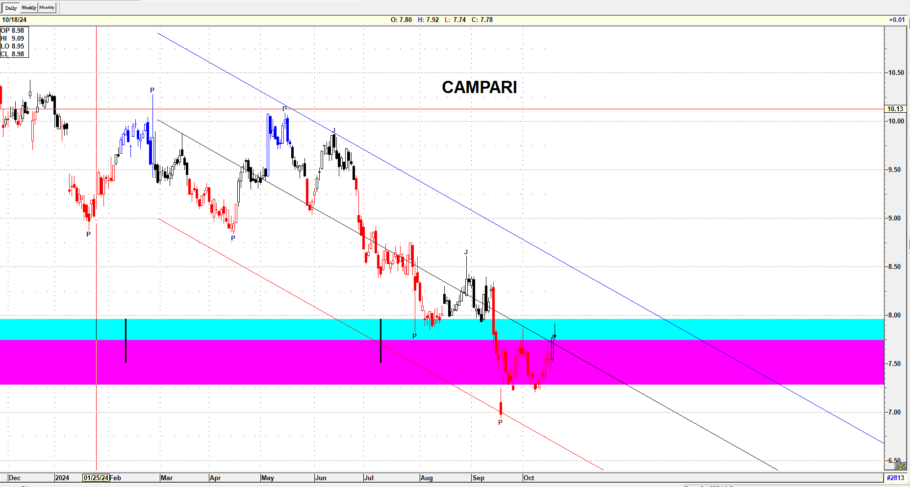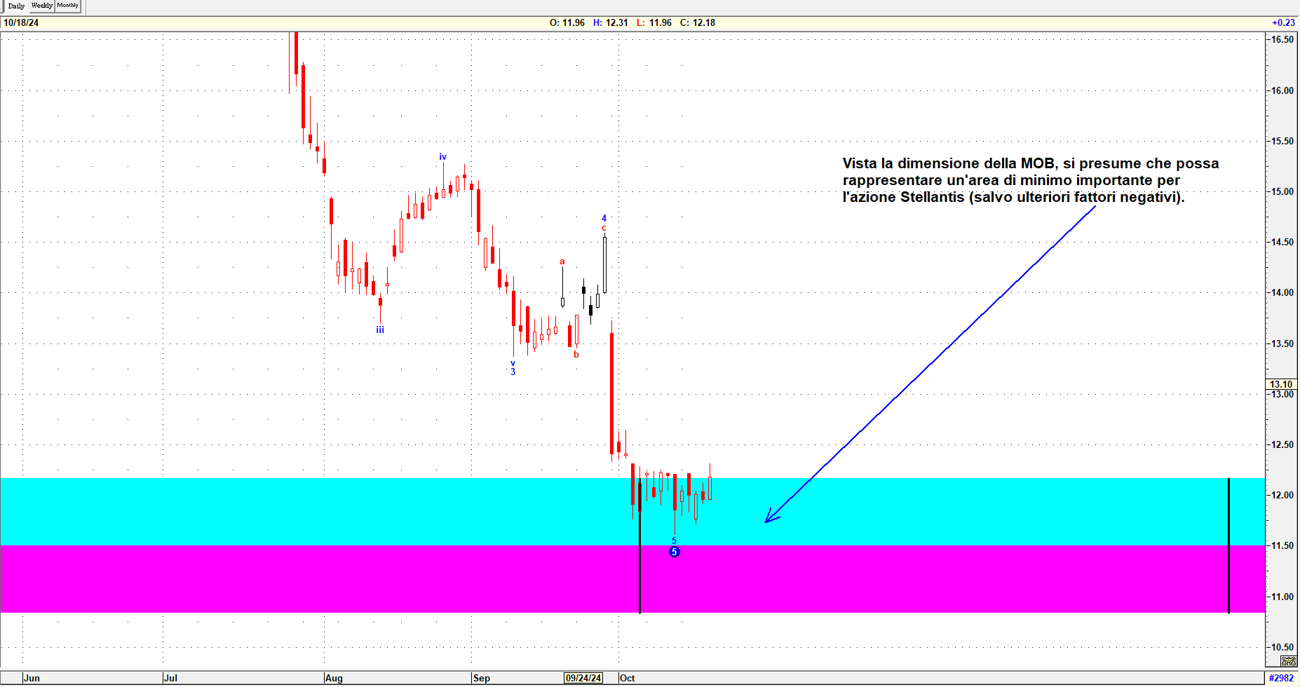 Campari si trova in una situazione simile a quella di Stellantis, con il titolo posizionato su una MOB di supporto rilevante (da notare la sua ampiezza). È possibile che si stia formando una zona di consolidamento.