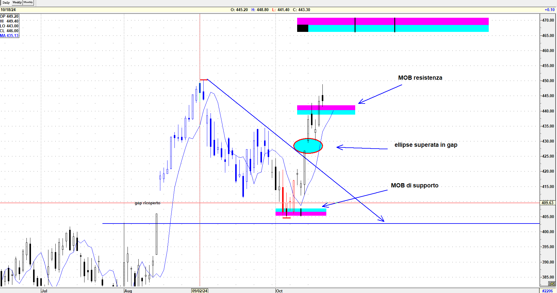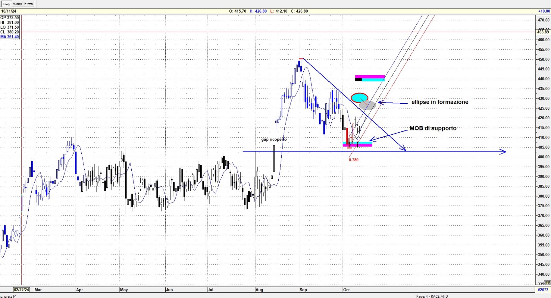 L’ellipse è stata superata con forza, addirittura in gap up, indicando un segnale di rafforzamento del trend. Successivamente, il titolo ha approcciato la MOB e si è arrestato poco distante dal massimo precedente. Il software non ha ancora rilevato l’impulsività del trend attuale (XTL non è ancora di colore blu, vedi spiegazione sotto), fornendo così un segnale contrastante. La MOB target si colloca nell'area tra 465/470. Nei prossimi giorni, l'area di massima attenzione sarà quella del massimo precedente: il suo superamento potrebbe indicare un ulteriore rafforzamento, con obiettivo successivo nella zona della MOB superiore
