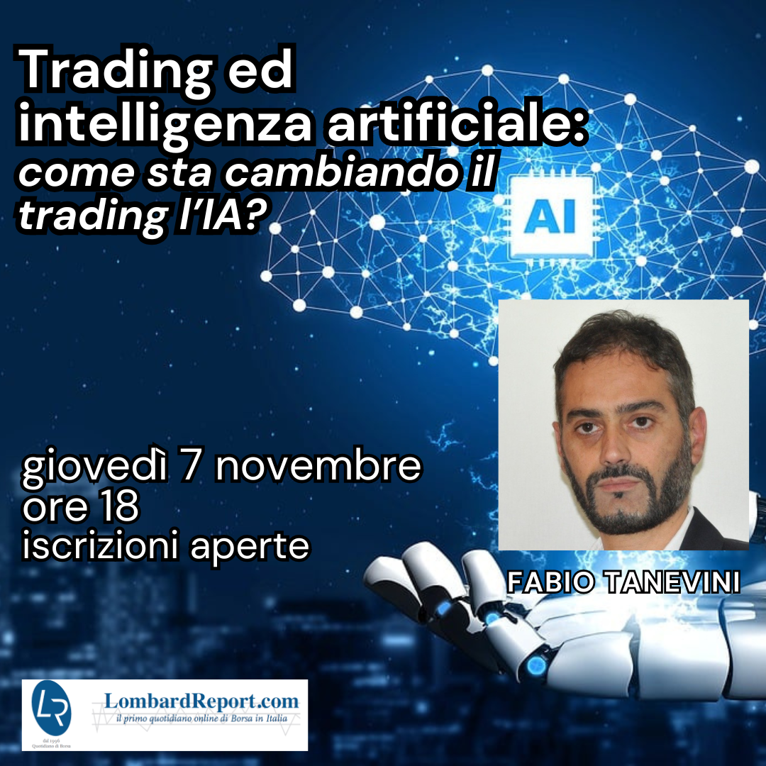 Giovedì 7 novembre dalle ore 18 saremo con Fabio Tanevini per un nuovo appuntamento in diretta targato LombardReport.com. Con Tanevini parleremo di come il trading sta cambiando pelle con l’arrivo dell’intelligenza artificiale, cercando di capire quali sono le sue potenzialità, ma anche i problemi che possono emergere nel lavoro di trader.