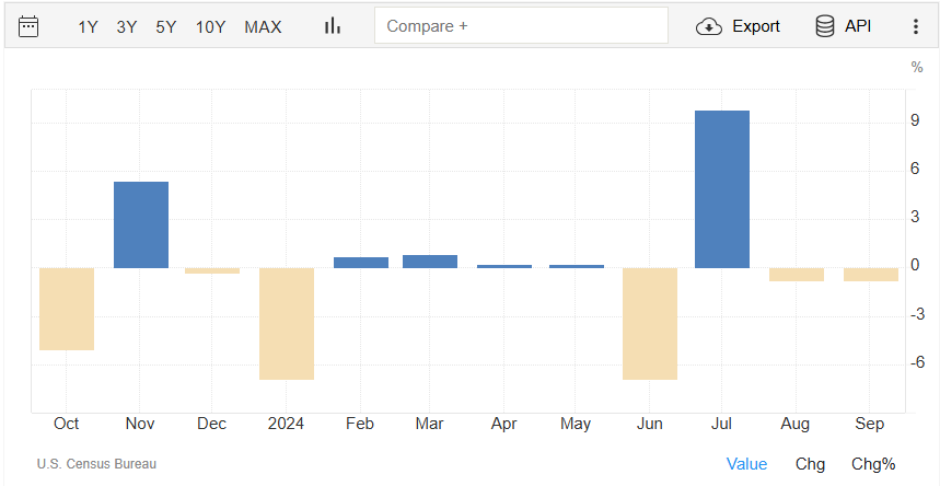 Il dato preliminare di settembre sugli ordini di beni durevoli a livello mensile registra un -0,8%, come ad agosto (rilevazione rivista da +0,0%). Il dato è rilasciato dall’U.S. Census Bureau.