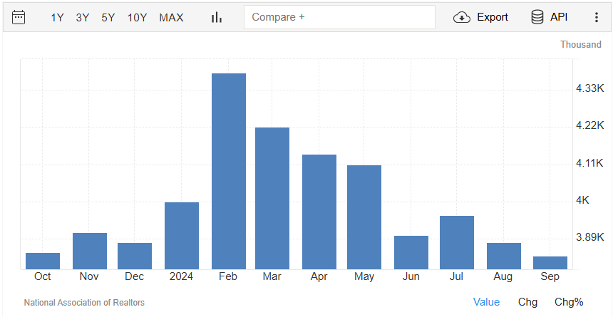 Il numero di abitazioni esistenti vendute a livello mensile a settembre registra un -1,0%, passando dalla rilevazione di 3,88 milioni di agosto (rivista da 3,86 milioni) a quella di settembre di 3,84 milioni. Il dato è rilasciato dalla National Association of Realtors.
