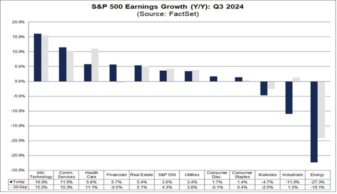 Otto degli undici settori stanno segnalando una crescita anno su anno, guidati dai settori Information Technology e Communication Services. D'altro canto, tre settori stanno segnalando un calo anno su anno degli utili, guidati dai settori Energy e Industrials.