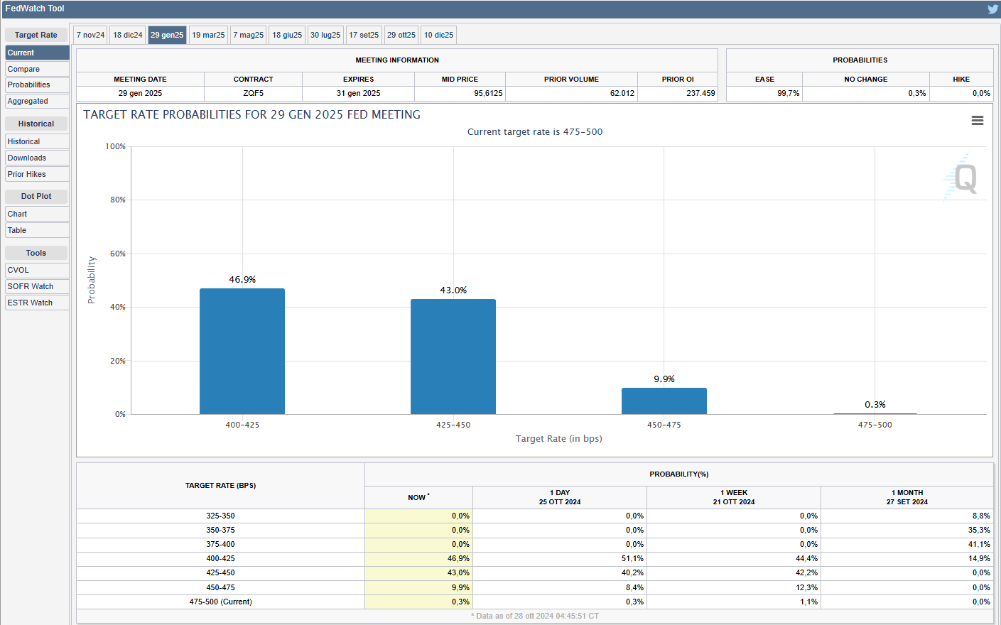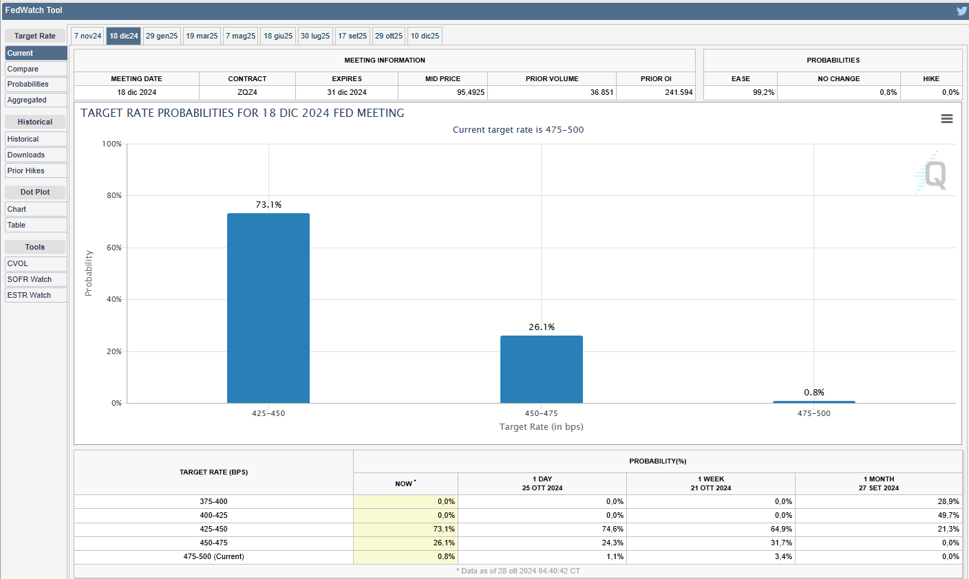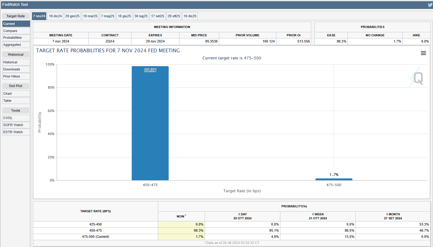 Lo strumento FedWatch del CME Group mostra la quasi totalità di probabilità del secondo taglio dei tassi riguardo alla prossima riunione di mercoledì 7 novembre. Al momento le probabilità per un taglio di 25 bps sono al 98,3% (v. grafico):