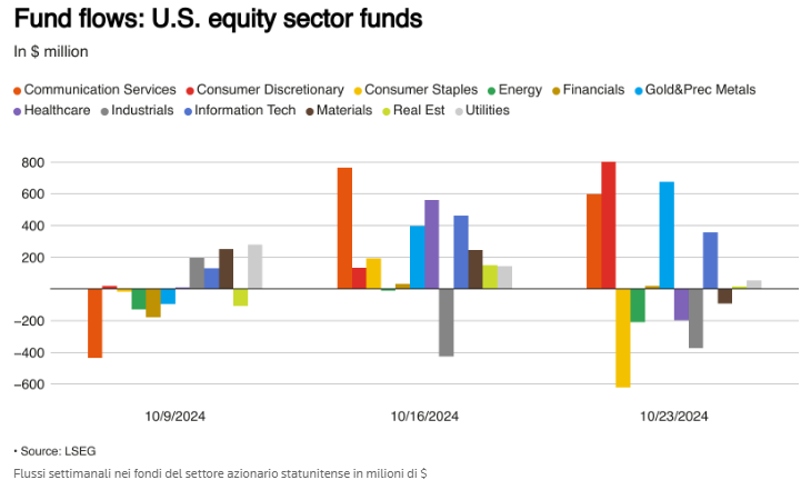 I fondi azionari settoriali statunitensi, tuttavia, hanno guadagnato afflussi per la seconda settimana consecutiva, per un valore netto di 1,03 miliardi di $. Gli investitori hanno rastrellato beni di consumo discrezionali, oro e metalli preziosi e fondi del settore dei servizi di comunicazione per un valore rispettivamente di 802 milioni di $, 677 milioni di $ e 599 milioni di $.
