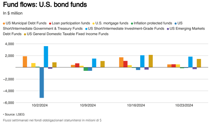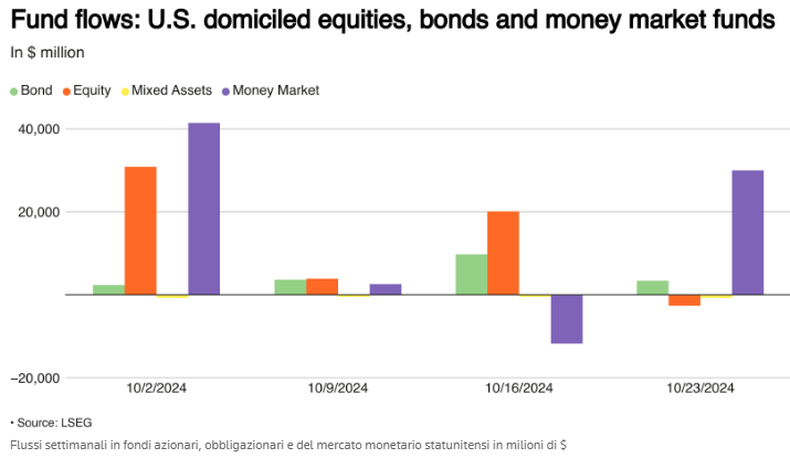 I fondi del mercato monetario statunitense hanno attirato afflussi consistenti nella settimana conclusasi il 23 ottobre, poiché l'incertezza sulle elezioni presidenziali statunitensi e una rivalutazione delle prospettive sui tassi d'interesse della Federal Reserve hanno aumentato la domanda di asset più sicuri.