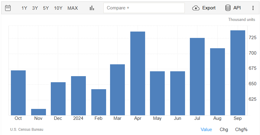 Il dato sulle vendite di nuove case hanno sorpreso in positivo a settembre. Il dato si attesta a 738 mila, registrando un +4,1% rispetto al mese precedente: la rilevazione di agosto era di 709 mila (rivista da 716 mila). Il dato è rilasciato dall’U.S. Census Bureau.