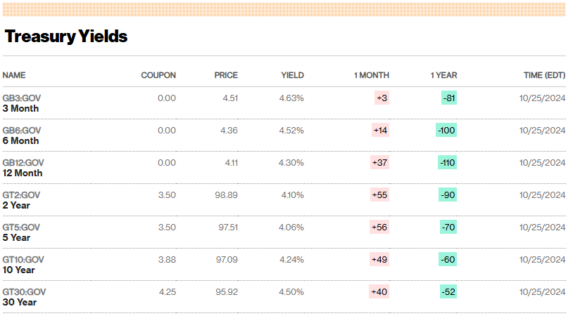 I rendimenti dei titoli del Tesoro di riferimento, la scorsa settimana sono saliti ai massimi degli ultimi tre mesi, riflettendo le aspettative di una FED potenzialmente meno accomodante e di una possibile spesa maggiore sotto il prossimo Presidente. Le scommesse sulla prevalenza di Donald Trump sono aumentate sui mercati delle previsioni nelle ultime settimane, con il repubblicano visto come sostenitore di politiche le cui tariffe potrebbero portare a un'inflazione più elevata.