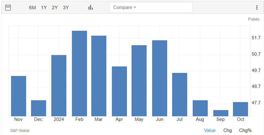 Venendo ai PMI flash di ottobre, questi sono usciti leggermente migliori delle attese, ed in generale continuano a indicare una crescita elevata, grazie ai servizi, mentre il manifatturiero è ancora in contrazione. Il dato preliminare di ottobre del PMI manifatturiero S&P Global si attesta a quota 47,8 punti, in crescita rispetto ai 47,3 punti di settembre e sopra al consensus di 47,5 punti.