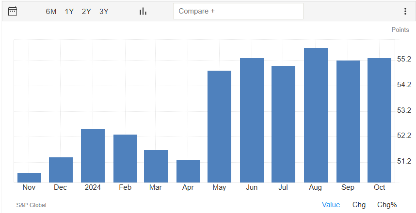 Il dato preliminare di ottobre relativo al settore dei servizi, invece, è pari a 55,3 punti, quasi precisamente in linea con la rilevazione di settembre di 55,2 punti e sopra al consensus di 55,0 punti.