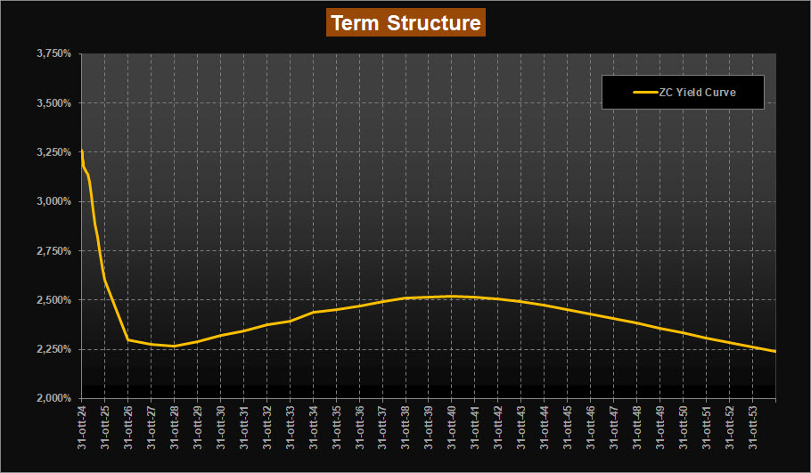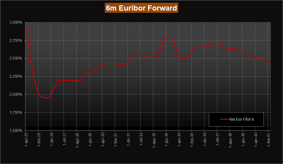 In via di assestamento anche le previsioni fornite dai tassi forward su Euribor 6 mesi sulle scadenze a breve, con tassi attesi ora in area 2,90% per il primo trimestre 2025, con la discesa verticale sulla parte a breve che è sempre più corta in termini di escursione. Sotto questo profilo, sono confermate le aspettative sui tagli dei tassi che portano la curva dei forward poco sotto area 2,00% per i primi mesi del 2026. Stabili le previsioni di risalita dei tassi, visti sempre verso area 2,70%, a partire dal 2034.