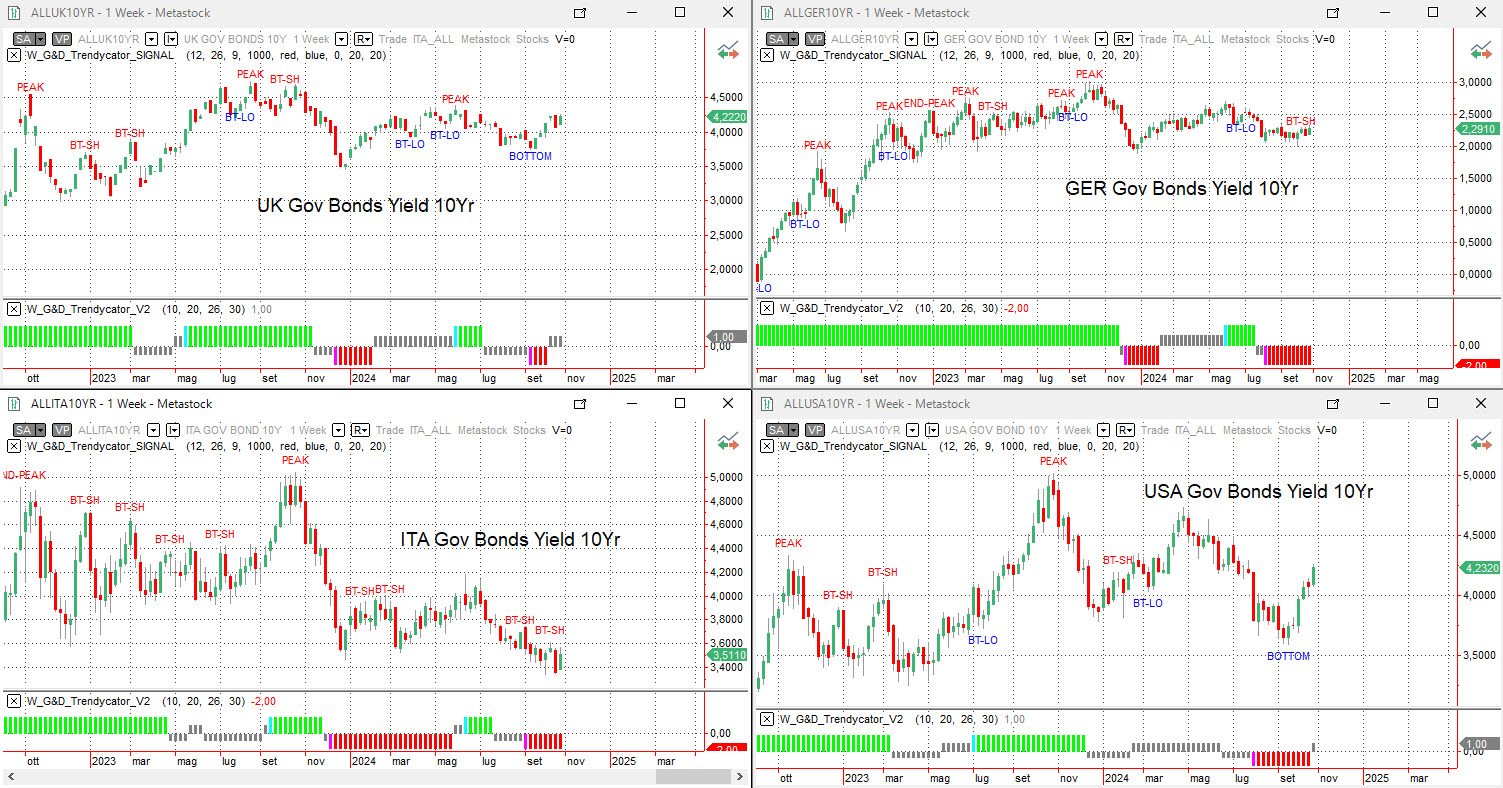 Analizzando con il Trendycator le curve dei rendimenti su scala settimanale dei principali benchmark decennali si nota una fase altalenante nell’attesa delle prossime mosse delle banche centrali.