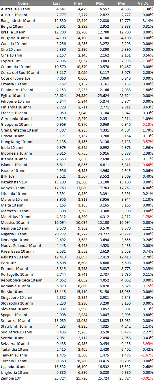 Tabella dei rendimenti, su base settimanale, delle obbligazioni governative mondiali con qualunque rating. Il ranking considera i bond benchmark decennali in tutte le valute di emissione. In alcuni casi, per alcuni emittenti o per alcune valute, il rapporto rischio/rendimento di questi bond può essere anche piuttosto speculativo.