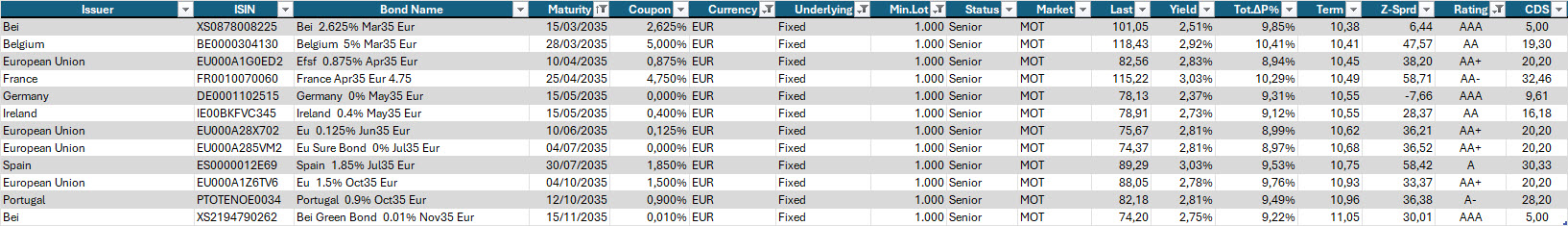 Una possibile selezione di bond con scadenze decennali, tutti investment grade con rating non inferiore ad A-, è presentata nelle tabella qui sotto.