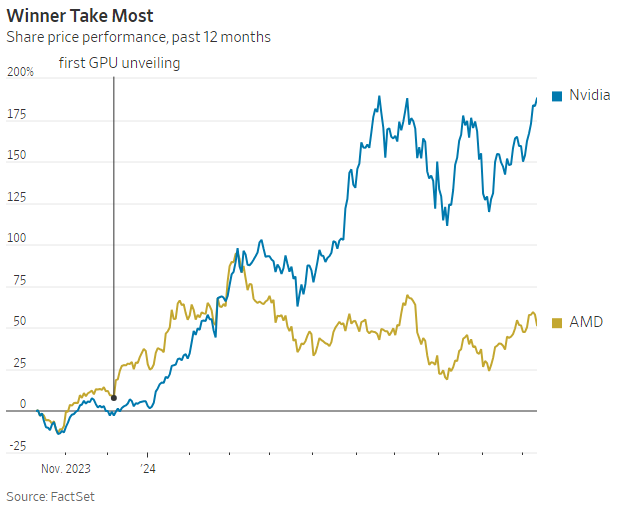 AMD ha già più che raddoppiato quell'obiettivo, prevedendo un fatturato GPU di oltre 4,5 miliardi di $ per quest'anno durante la sua ultima chiamata sui guadagni a luglio. Ma questo sembra aver lasciato poco margine di rialzo per l'evento di giovedì, che ha deluso gli investitori che erano alla ricerca di ulteriori aggiornamenti sulle prospettive finanziarie dell'azienda. Ciò è in contrasto con la presentazione dell'anno scorso, che ha fatto schizzare le azioni del 25% nel mese successivo dopo essere già salite dell'80% dall'inizio dell'anno. AMD è stata per lo più un ritardatario quest'anno, rispetto sia al pari delle società dei semiconduttori che al mercato più ampio. La capacità dell'azienda di mettere in campo chip AI convincenti non è una preoccupazione. Ma AMD ha altre linee di business esposte a rallentamenti nella domanda sia per i personal computer che per le console per videogiochi. E la sfida di un incumbent molto potente significa che l'azienda ha ancora dei dubbi, anche considerando le forti vendite delle sue prime offerte GPU. Le azioni di NVIDIA sono salite del 172% quest'anno dopo un enorme guadagno del 239% l'anno scorso, portando la capitalizzazione di mercato del produttore di chip a 3,3 trilioni di $, seconda solo a quella di APPLE.