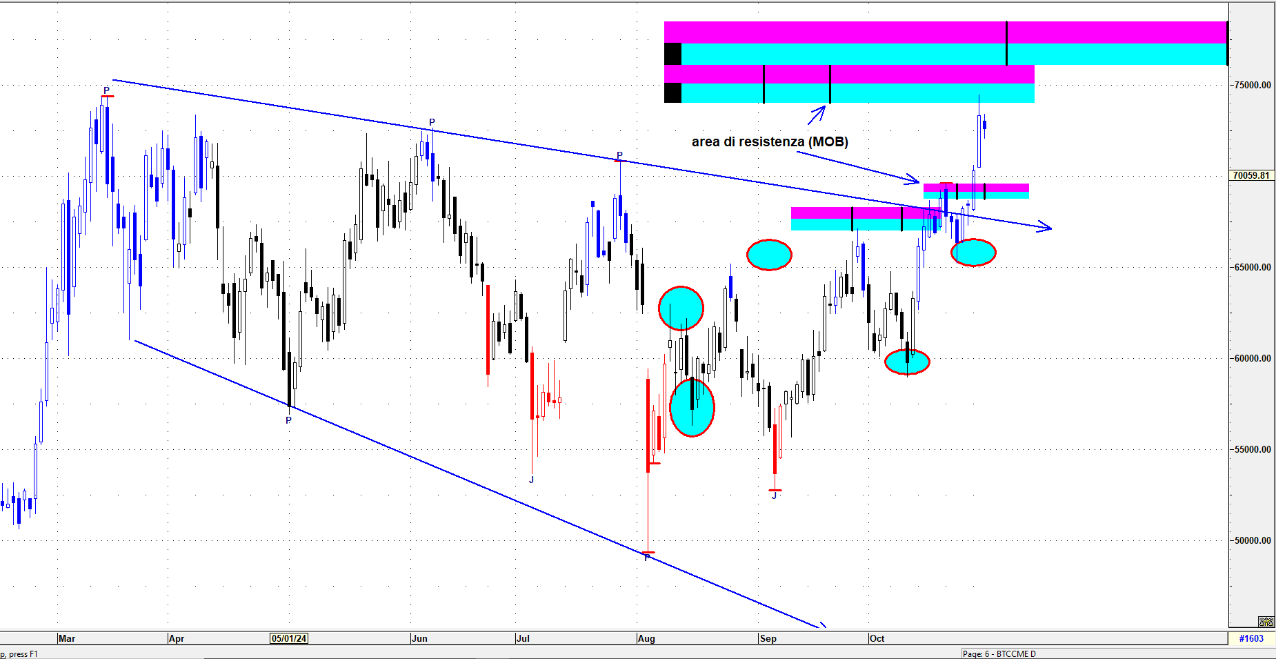 La volta scorsa dicevamo che in caso di superamento della MOB il primo obbiettivo sarebbe stato 74/75000, area toccata nella giornata di ieri.