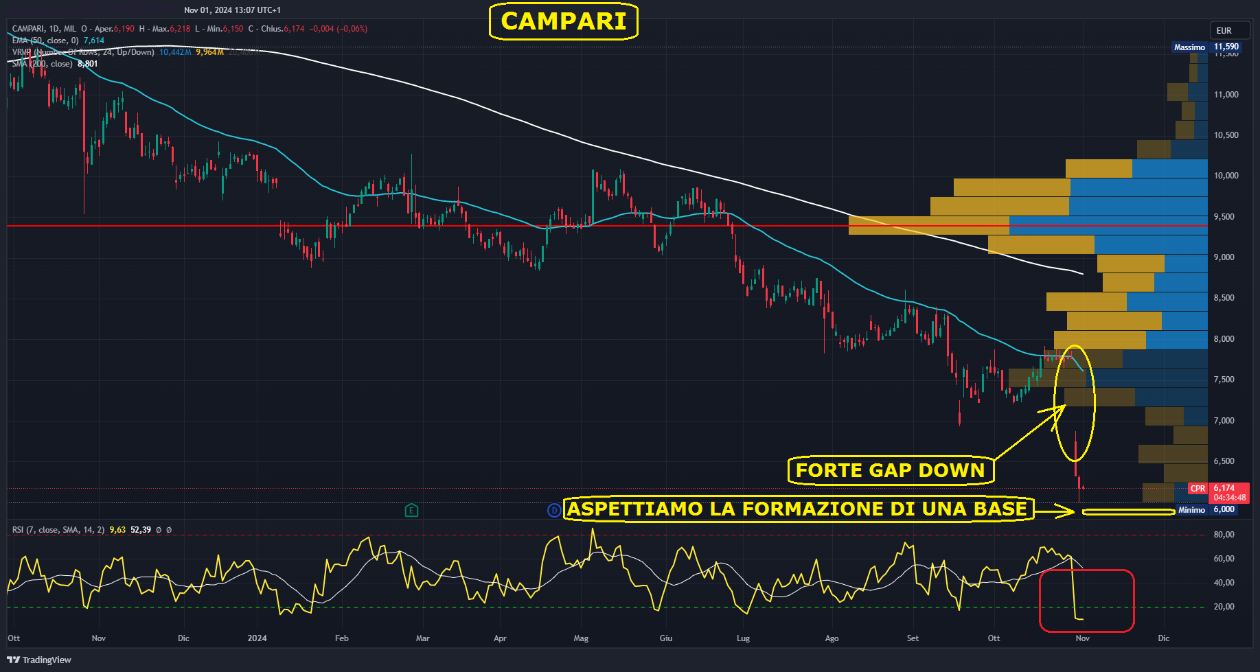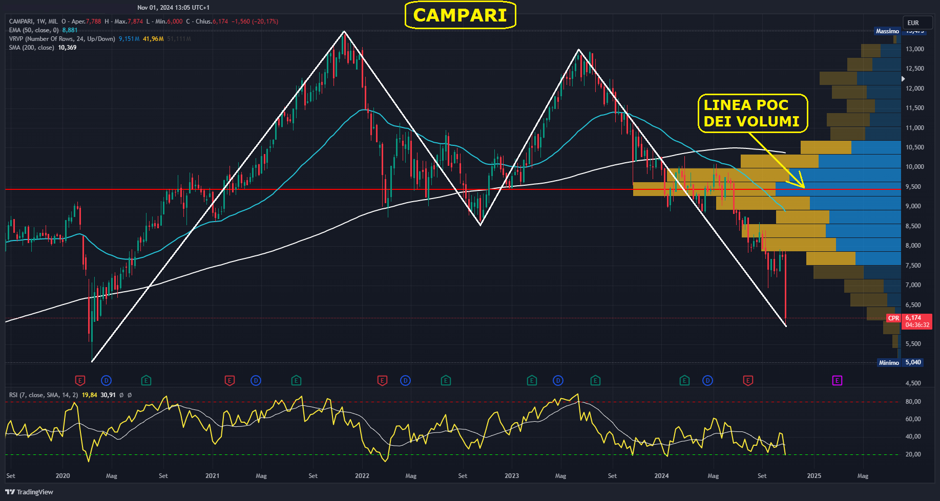 La pubblicazione dei risultati del terzo trimestre del 2024, di martedì scorso, ha portato ad un calo del titolo in Borsa. In seguito all’uscita dei dati, che hanno disatteso le aspettative del mercato, spingendo gli analisti a rivedere le proprie stime e abbassare i target price, Campari ha registrato un ribasso sul grafico che l’ha spinta a toccare nuovi minimi da marzo 2020. Mercoledì il titolo ha aperto in gap down, attestandosi sotto quota 7€ ed arrivando nel corso della giornata ad un minimo di 6,326 €. Il calo è proseguito giovedì 31 ottobre, quando è stato toccato un minimo di 6,00 €.
