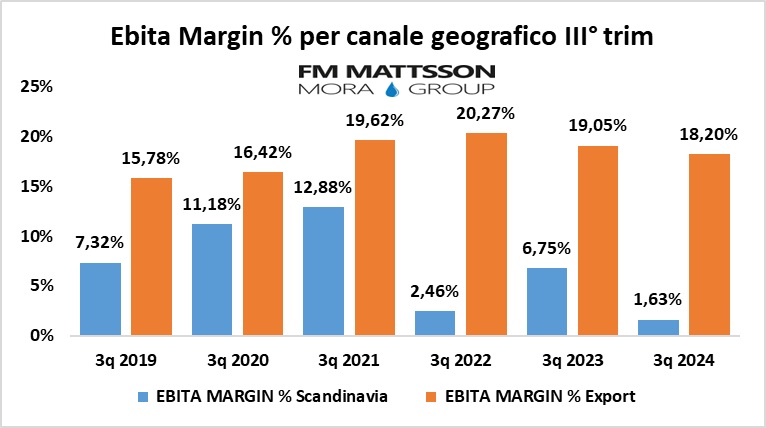 Analizzando la marginalità per settore geografico si nota che l'Export mantiene gli ottimi livelli evidenziati negli anni precedenti mentre il mercato domestico, come ampiamente indicato in precedenza, riporta un dimezzamento dei margini con trend in peggioramento nel corso del III° trimestre.