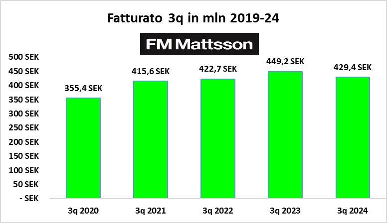 Nel terzo trimestre 2024, i ricavi sono stati pari a SEK 429,4 mln, in diminuzione del 4,4% rispetto ai SEK 449,2 mln del terzo trimestre 2023. Anche qui, la crescita organica è stata negativa (-2,6%).