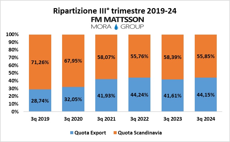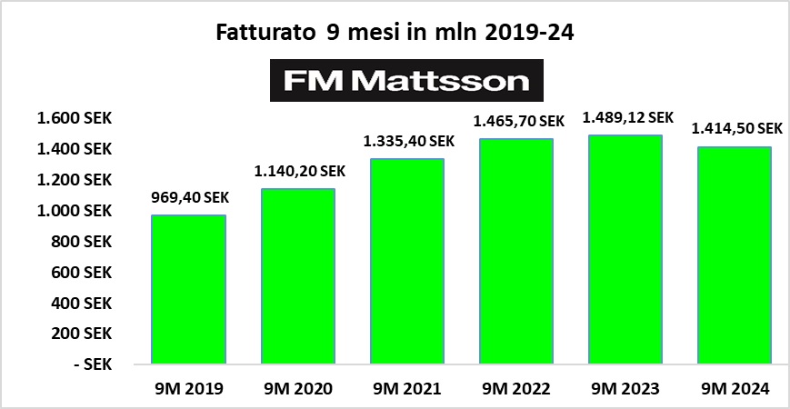 Nei primi nove mesi del 2024, FM MATTSSON ha registrato un fatturato di SEK 1,414 mln, in calo del 5,0% rispetto ai SEK 1,489 mln dello stesso periodo del 2023. Il dato di crescita organica, che esclude l'effetto di acquisizioni e cambiamenti nei cambi valutari, è stato negativo a -4,8%, evidenziando un rallentamento strutturale della domanda, principalmente nel mercato nordico.