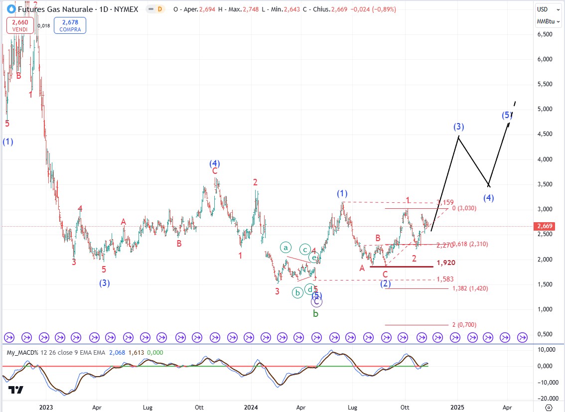 Il cacao potrebbe aver concluso la lunga fase correttiva sul minimo evidenziato sul grafico ed il movimento successivo può essere l’1-2 di una nuova fase impulsiva. Su grafico orario si vedono piuttosto bene i movimenti i 5 movimenti di onda (1). Ma come ho detto la scorsa settimana durante i mesi scorsi abbiamo rietichettato più volte il modello passando da scenari rialzisti a scenari ribassisti. Alla fine i lettori e io stesso rischiavamo di mandare il cervello in pappa per cui restiamo in wait. Se l’ipotesi che faccio è corretta i prezzi dovranno salire e rompere al rialzo il rettangolo. Se sarà così allora riprenderò l’etichettatura dal massimo di onda [V]. Idem se il rettangolo fosse rotto al ribasso. Finché i prezzi restano dentro alla zona di congestione, fermi alla finestra.
