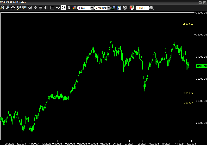 Fermi restando quindi le posizioni conseguite al termine della settimana appena conclusa, una eventuale perdita di minimi settimanali ai 32900, potrebbero portare ad una direzionalità al punto switch e di rimbalzo ai 30600 e 29700 che è decisamente il più importante nell'attuale configurazione.