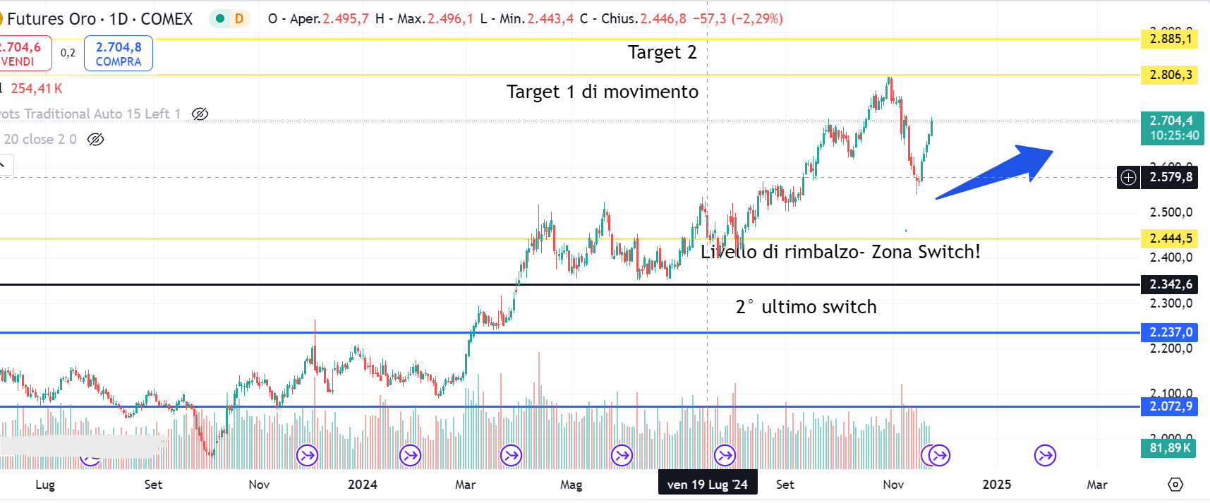 Qualora infranto resterebbe il valore dei 2350 dollari l'oncia a determinare un vero e proprio cambio di scenario, ma questo solo qualora venisse rotto al ribasso, mantenendo la caratteristica di punto di rimbalzo e di buy al tocco.