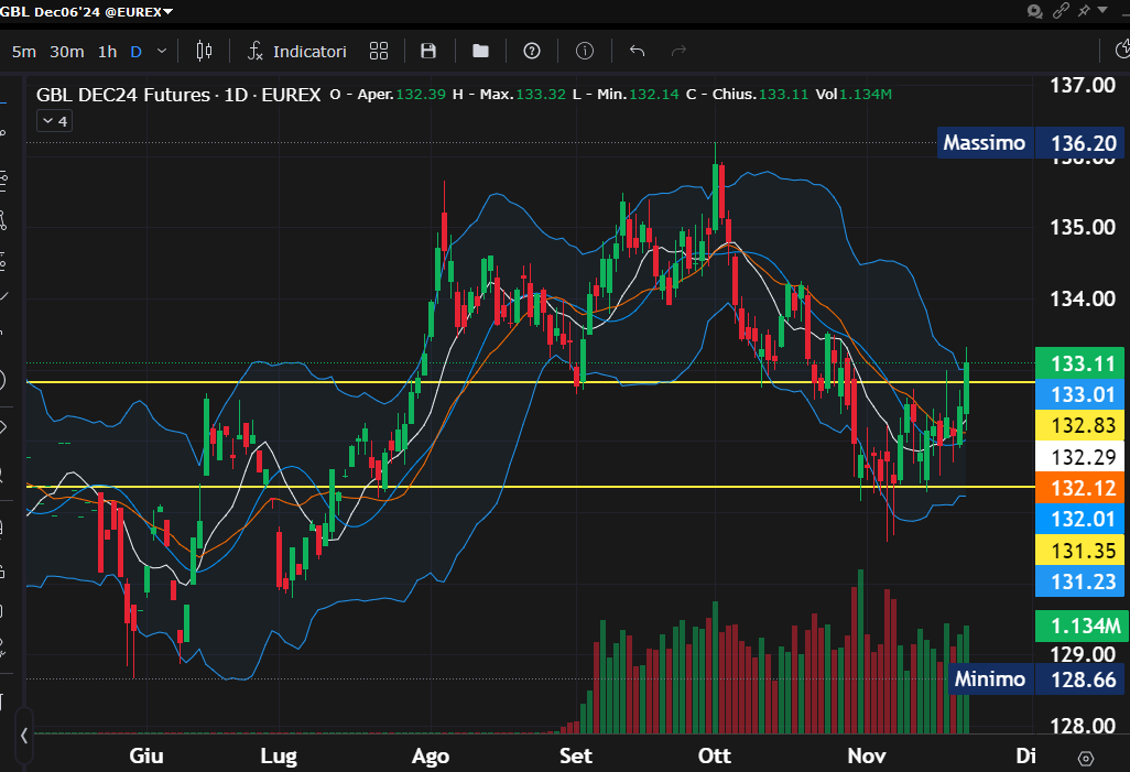 Il Bund, termometro chiave dei mercati obbligazionari europei, ha offerto spunti interessanti nell'ultima settimana. Facendo riferimento al grafico già mostrato in precedenti analisi, possiamo identificare due livelli cruciali per l'andamento del future: il primo, più significativo in termini direzionali, si trova a 132.81 punti, una soglia che era stata infranta già prima delle elezioni statunitensi.