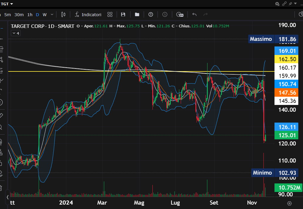 Il titolo Target (NYSE) ha subito un crollo significativo dopo la pubblicazione dei deboli risultati del terzo trimestre, evidenziando difficoltà legate sia ai margini operativi che alle pressioni competitive esercitate dai Big 3 del settore retail: Amazon, Walmart e Costco. La reazione dei mercati è stata severa, con una discesa marcata del prezzo delle azioni.